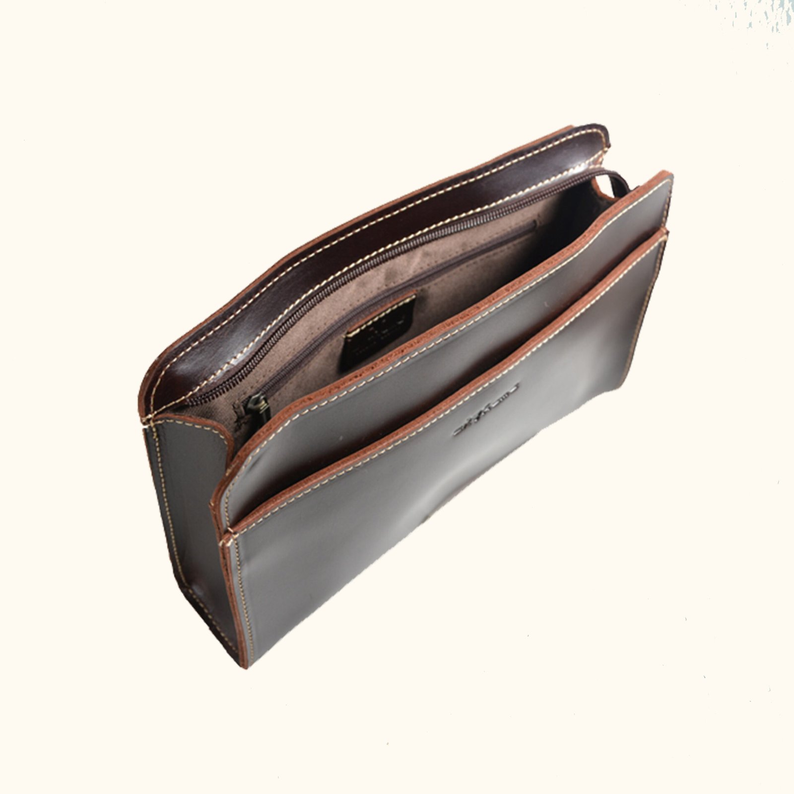 A versatile natural-grain leather wristlet/sling bag with multiple compartments and detachable straps, designed for organized storage and flexible carry as a wristlet, clutch, or shoulder bag.