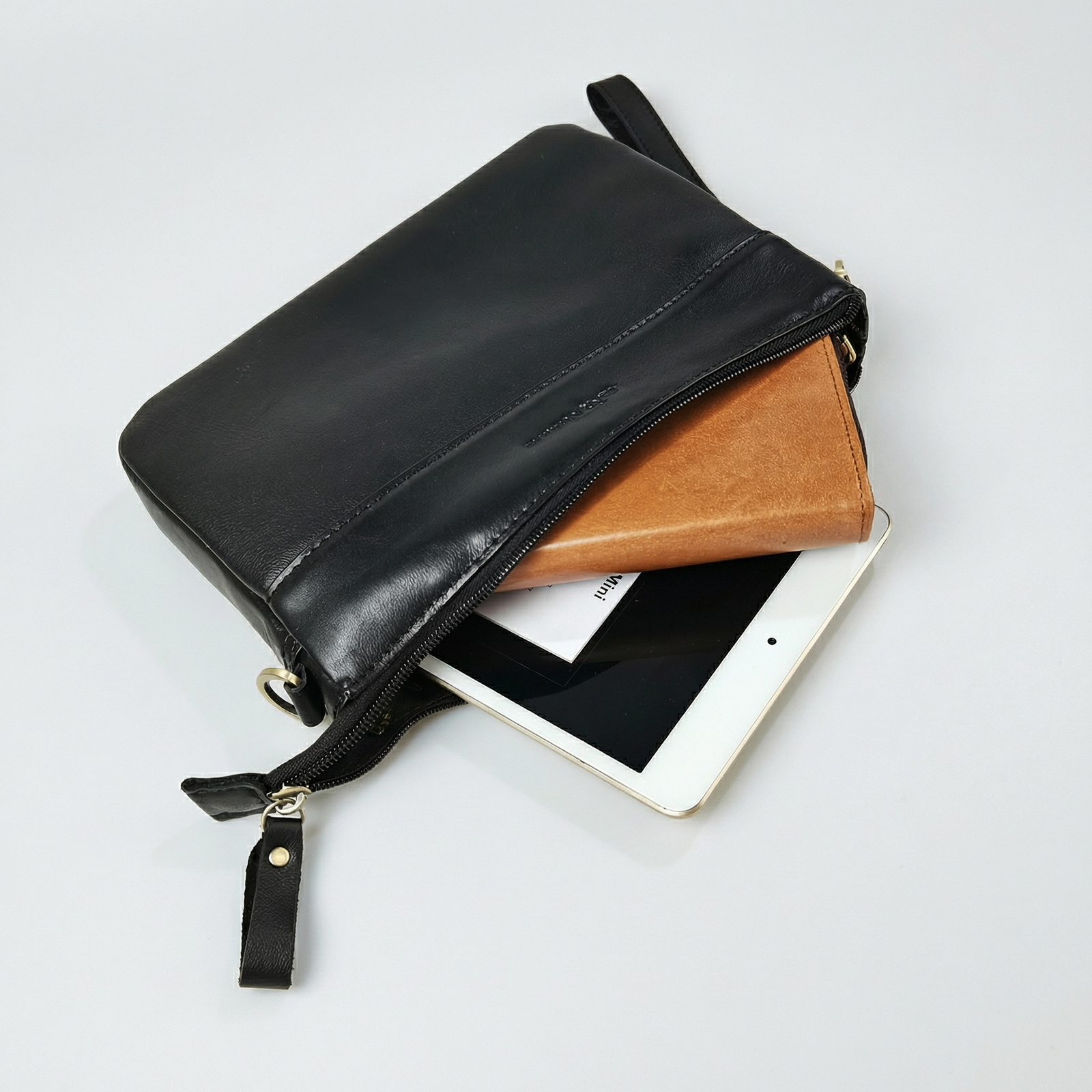 Designed for the man who values both refined style and practical versatility, this bag is crafted from premium full‑grain cow leather—a material that offers exceptional durability and develops a rich character over time. Its convertible design allows you to carry it as a sleek clutch for formal occasions or attach the adjustable and detachable long strap to wear it as a crossbody bag for everyday convenience. The thoughtfully organized interior features a spacious main zipper compartment that comfortably fits an iPad Mini 7.9″, making it ideal for work or travel. Inside, you will also find a dedicated internal zipper pocket compartment to secure smaller valuables, while a back compartment provides quick‑access storage for items like your phone or passport. Whether you are heading to a business meeting, a weekend getaway, or simply navigating the city, this full‑grain leather bag combines timeless craftsmanship with the functionality you need.